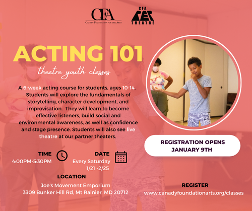 Join us for our 6 week acting course where participants will explore the fundamentals of storytelling, character development, and improvisation. Throughout the course, students will learn to become effective listeners, build social and environmental awareness, as well as confidence and stage presence. Concluding the course, students will present a theatrical presentation displaying characters, monologues, and scenes they’ve developed throughout class. Students will see live local theatre at our partner theaters, The National Theatre and Theatre J.